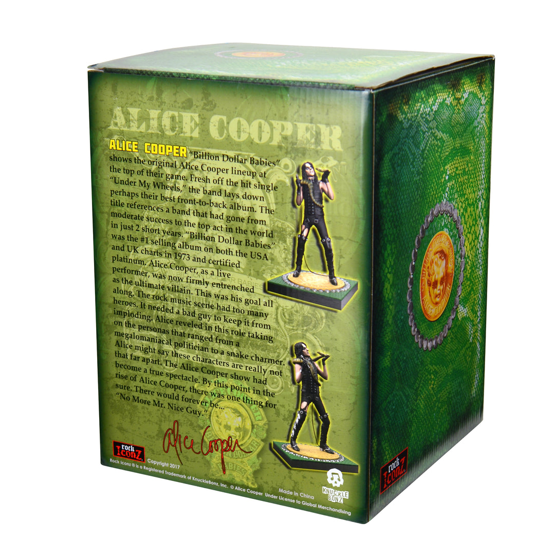 Alice Cooper is dressed in all black with a microphone while gazing into the eyes of his green boa constrictor. The Alice Cooper II Snake Rock Iconz Statue stands about 9-inches tall and is made of polyresin. The statue is hand-painted in tremendous detail by a team of highly skilled artists, creating a remarkable likeness to Alice.