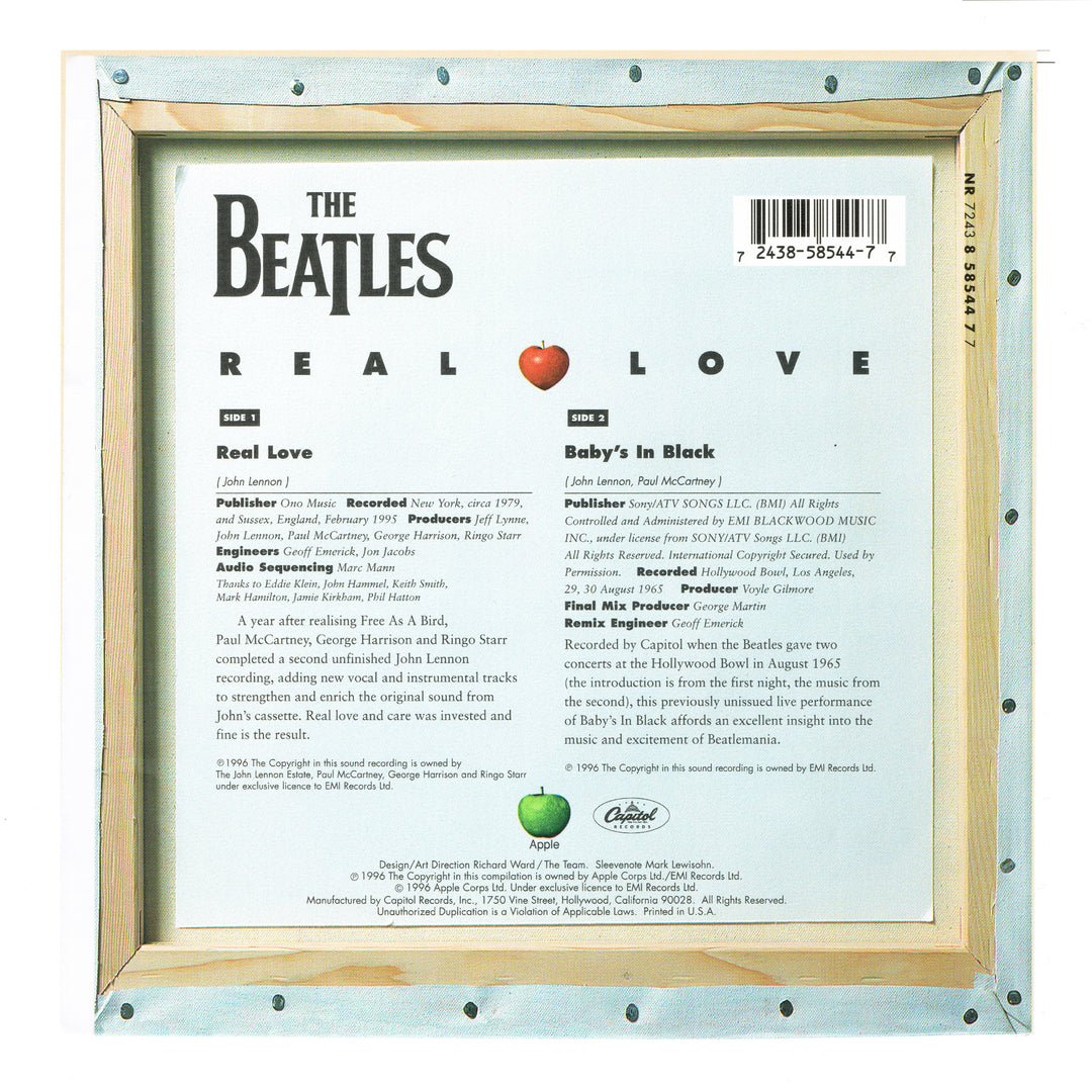 Real Love 1996 UK limited edition 2-track 7″ vinyl single also featuring an exclusive previously unreleased version of Baby’s In Black recorded live at the Hollywood Bowl in August 1965, paper picture sleeve.