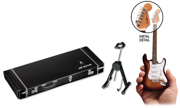 Each guitar model is approximately 10” long and comes complete with a high-quality miniature adjustable A-frame stand and an AXE HEAVEN® guitar case gift box stamped with silver foil.