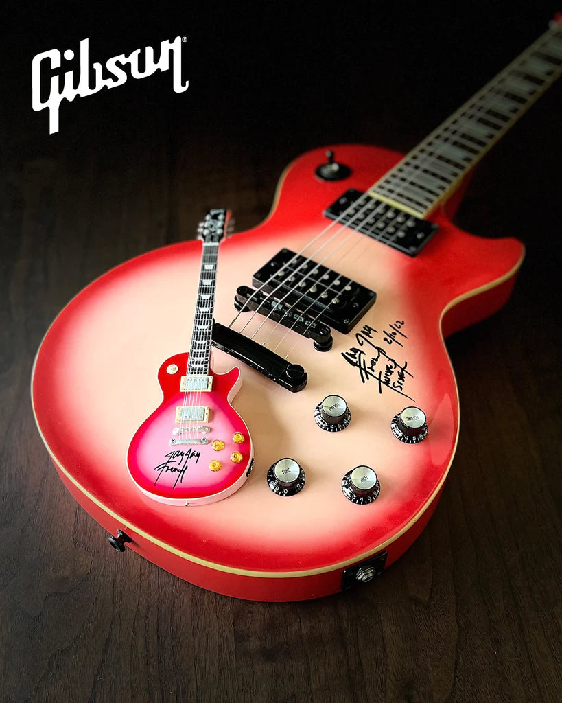 The miniature replica guitar is 1:4 scale and is individually handcrafted from solid wood with metal tuning keys, and is approximately 10” in length. It comes complete with a high-quality miniature adjustable A-frame stand, and a gold foil stamped Gibson by AXE HEAVEN® guitar case gift box.