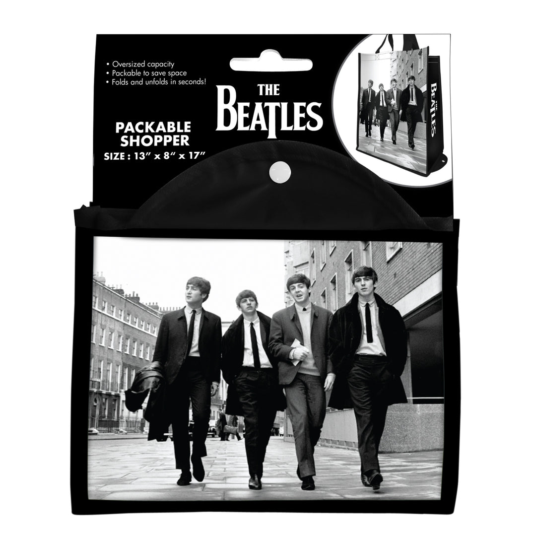 – The Beatles Packable Shopper Tote features an iconic image of the Fab Four as they walk together along a sidewalk in Liverpool. It folds into a convenient snappable pouch. Dimensions: 13 x 8 x 17″ h