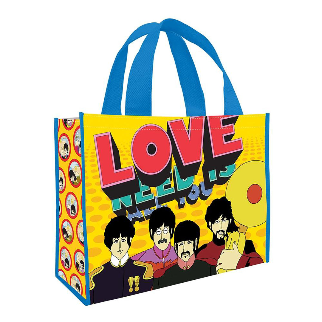 – The Beatles Yellow Submarine Large Recycled Shopper Tote features images from the Beatles’ hit The Yellow Submarine, so you can look great while carrying around your stuff. Dimensions: 16 x 6 x 12″ h Handles Feature an 8 inch Drop.