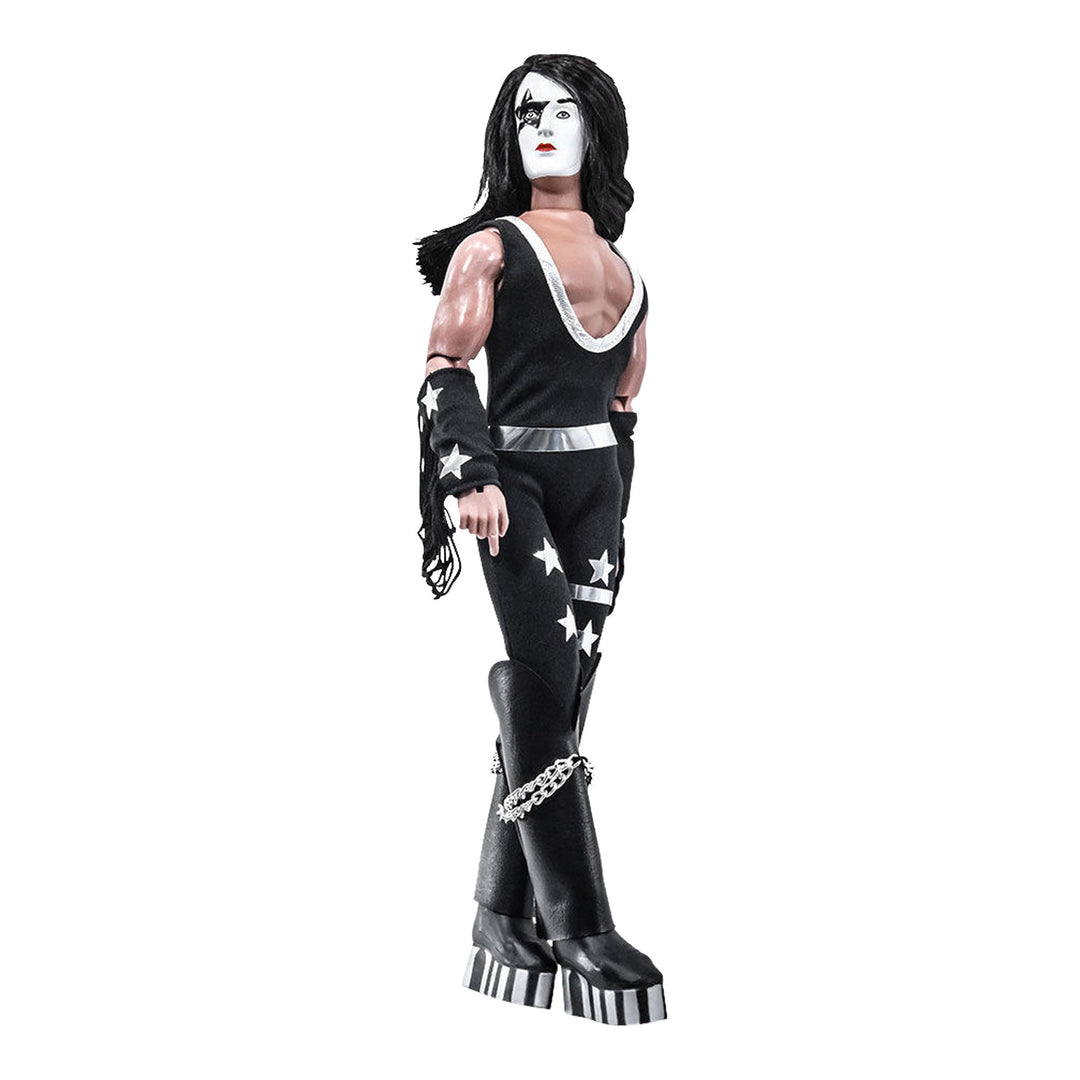 The Starchild’s face paint and stage outfit were derived from KISS’ Love Gun album that was released on June 17th, 1977. Based on the original Mego figure, Paul Stanley’s star-studded style is complete with a low-cut leotard and fringed arm cuffs, as well as his chained platform shoes! The Starchild 12-inch Action Figure comes with a KISS band mini T-shirt!