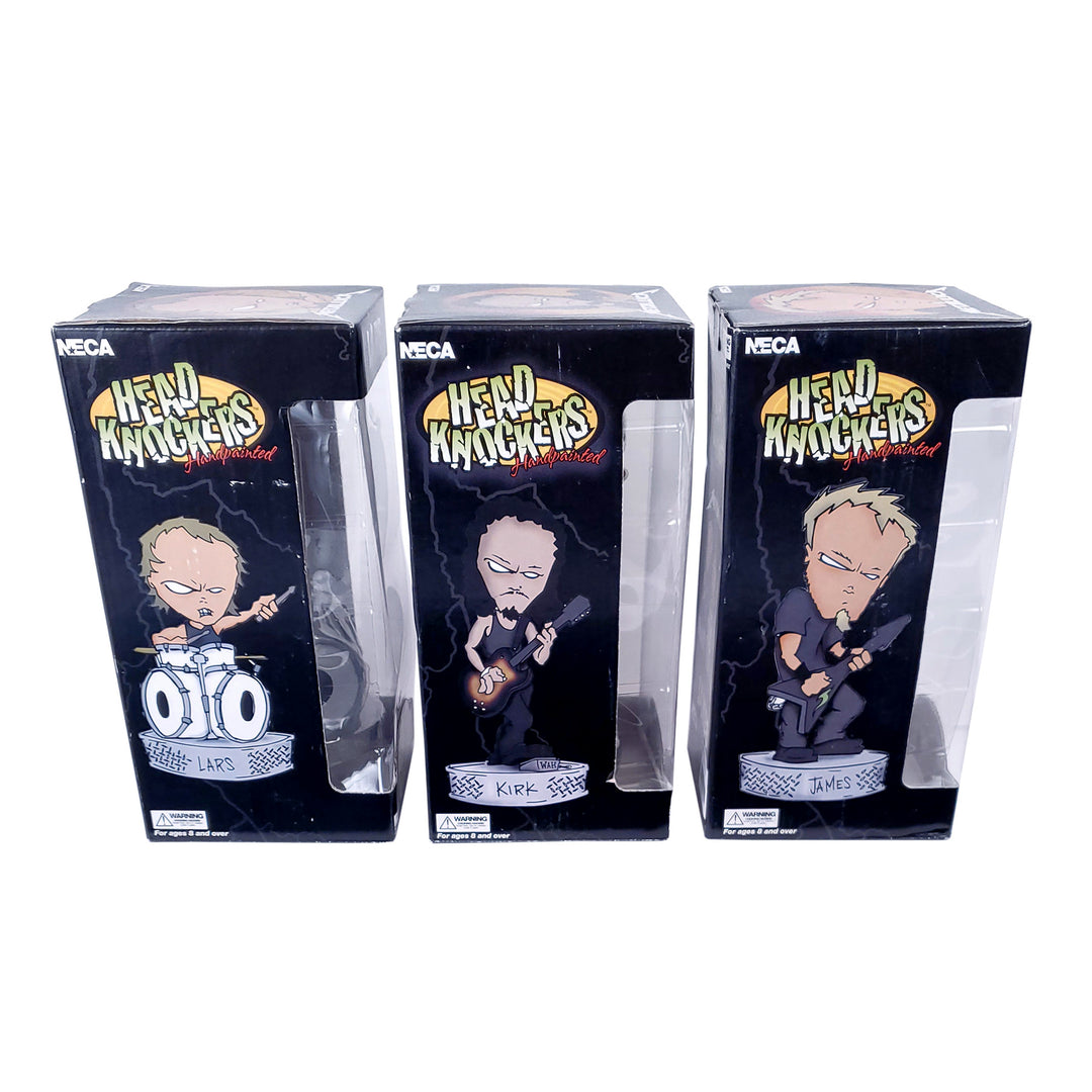 In 2003, NECA sent out a limited supply of the Head Knockers, James, Lars, and Kirk, to retail without Metallica’s design approval. Once Metallica saw them, the “animated evil” appearance was immediately rejected by the band members. They immediately ordered all retail stores to stop selling them and destroy the product. Metallica left NECA and contracted with SEG or Stevenson Entertainment Group to design and manufacturer a set of four bobbleheads that hit the market soon after.