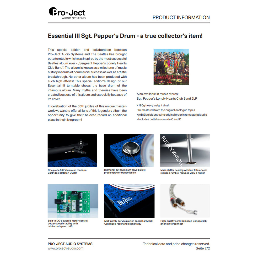 This special edition and collaboration between Pro-Ject Audio Systems and The Beatles have brought out a turntable, which was inspired by the most successful Beatles album ever – “Sergeant Pepper’s Lonely Hearts Club Band. ” The album is known as a milestone of music history in terms of commercial success and artistic breakthrough. No other album has been produced with such high efforts! This special edition’s design of our Essential III turntable shows the base drum of the infamous album. Many myths and theories have been created because of this album and mainly because of its cover.